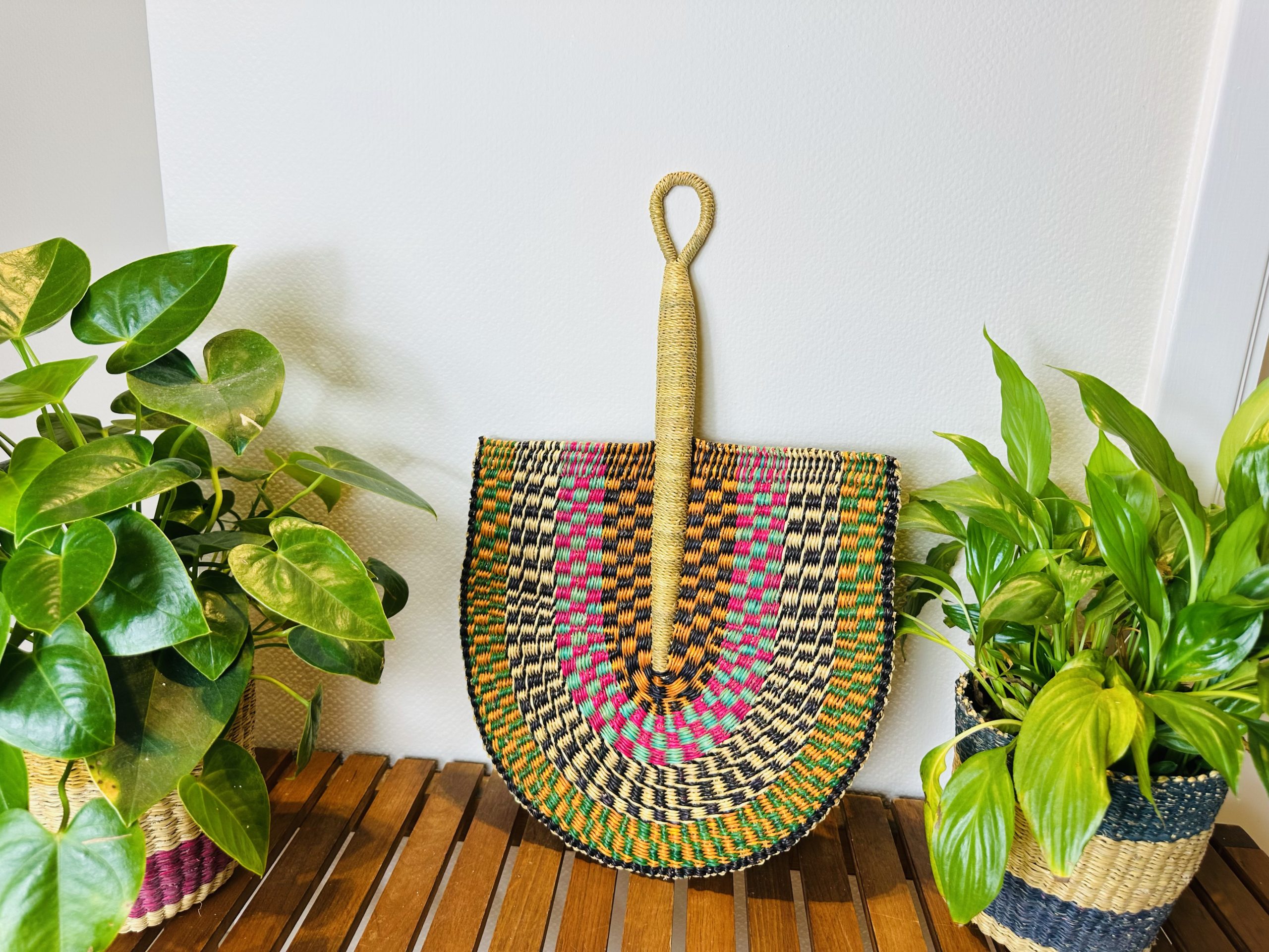 Handwoven using traditional Ghanaian techniques, this throw is made from natural fibers. It combines shades of straw, beige, red, green, and blue in beautiful geometric patterns. Sturdy, practical, and decorative, it’s ideal for cooling off or adding an authentic African touch to any interior.